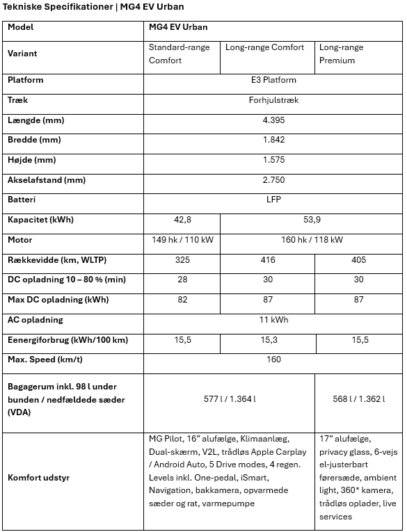MG4 EV Urban lanceres i Danmark i maj 2026 med seks farver og MG’s 7 års / 150.000 km garanti. Priser offentliggøres tættere på lanceringen.